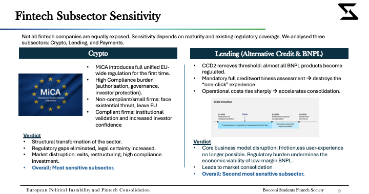 In this presentation, we analyze how regulatory uncertainty, higher interest rates, and geopolitical fragmentation across Europe are accelerating fintech consolidation, pushing investors toward compliance-ready models and making M&A the dominant exit path.